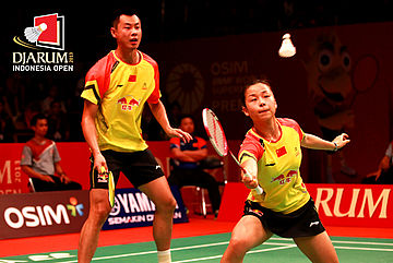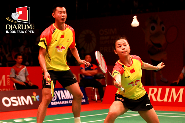 Pasangan ganda campuran asal China, Xu Chen/Ma Jin mengembalikan shuttlecock ke arah Robert Mateusiak/Nadiezda Zieba (Polandia).
