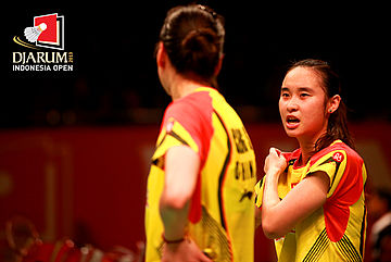 Bao Yixin/Cheng Shu (China) saar saling berkomunikasi di lapangan.