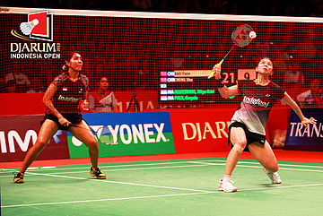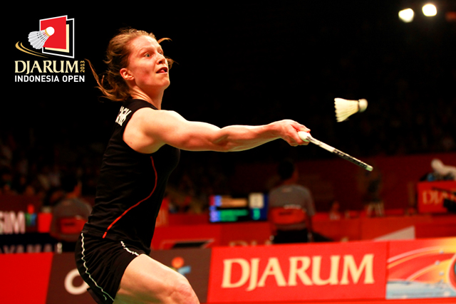 Juliane Schenk (Jerman) mengembalikan shuttlecock ke arah Tai Tzu Ying (China Taipei).