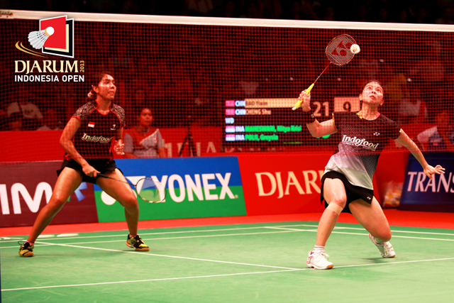 Nitya Krishinda Maheswari/Greysia Polii (Indonesia) berhasil menghadang serangan yang dilepaskan pasangan China, Bao Yixin/Cheng Shu.