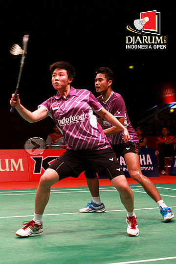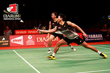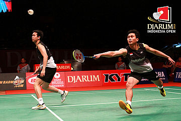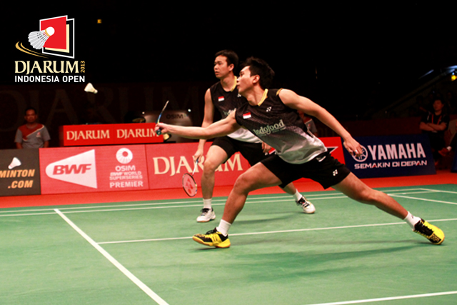 Mohammad Ahsan/Hendra Setiawan (Indonesia) mengembalikan shuttlecock ke arah pasangan asal Rusia, Vladimir Ivanov/Ivan Sozonov.