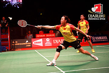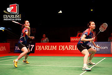Bao Xiyin/Cheng Shu (China) bersiap mengembalikan shuttlecock ke arah pasangan Tian Qing/Zhao Yunlei (China).