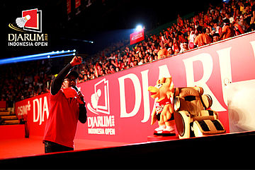 Steny Agustaf saat menyapa para suporter Indonesia yang memadati tribun di Istora Senayan.