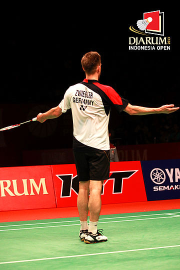 Marc Zwiebler (Jerman) mengembalikan shuttlecock ke arah Tommy Sugiarto (Indonesia).