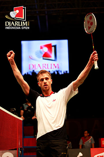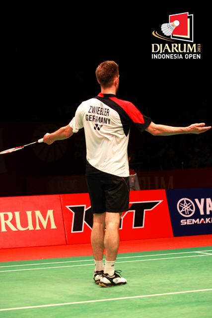 Selebrasi Marc Zwiebler (Jerman) setelah berhasil mengalahkan Tommy Sugiarto (Indonesia).