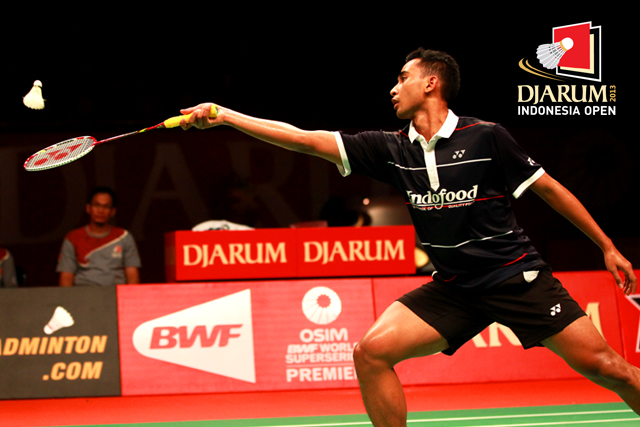 Tommy Sugiarto (Indonesia) mengembalikan shuttlecock ke arah Marc Zwiebler (Jerman).