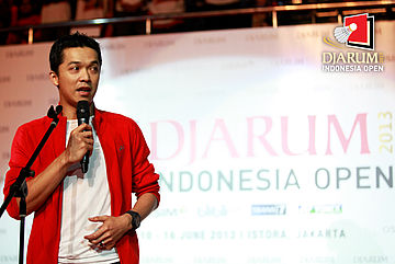 Taufik Hidayat memberikan apresiasi kepada ribuan pengunjung yang memadati Istora Senayan usai acara perpisahannya sebagai atlet bulutangkis profesional.