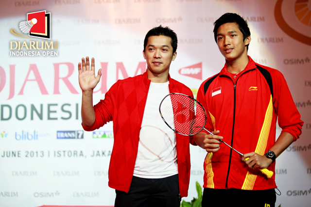 Taufik Hidayat (kiri) memberikan kenang-kenangan sebuah raket kepada salah satu atlet penerus Indonesia, Jonathan Christie.