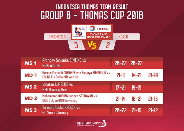 Tim Thomas Indonesia berhasil keluar sebagai juara grup B usai menaklukkan tim Korea Selatan dengan skor tipis 3-2. Firman Abdul Kholik lagi-lagi mampu tampil sebagai pahlawan bagi timnya setelah mengalahkan Ha Young-woong 20-22, 21-15, dan 21-15, pada partai kelima Grup B Piala Thomas 2018, di Impact Arena, Rabu (23/5).