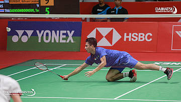 Ikhsan Leonardo Imanuel RUMBAY (Indonesia) berusaha mengembalikan shuttlecock