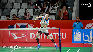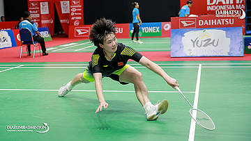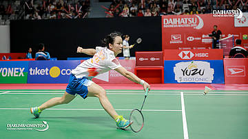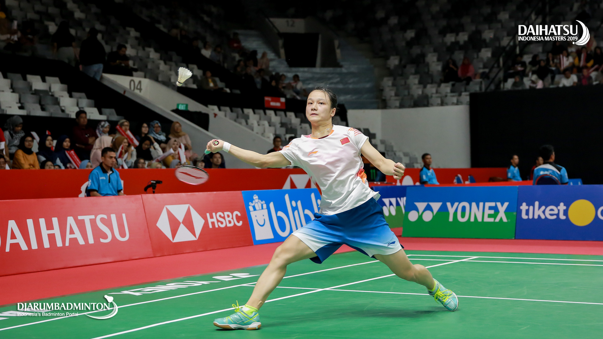 ZHANG Yiman (Tiongkok) berusaha mengembalikan shuttlecock