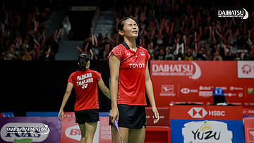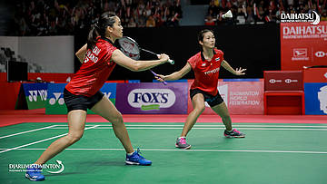 Jongkolphan KITITHARAKUL/Rawinda PRAJONGJAI (Thailand) bersiap menyambut shuttlecock