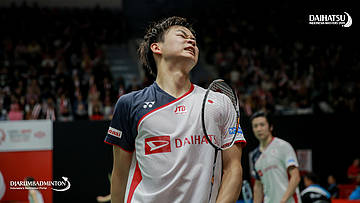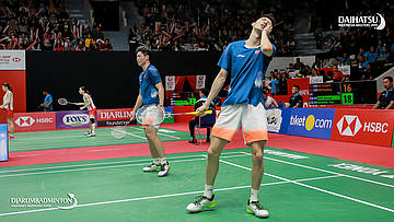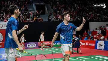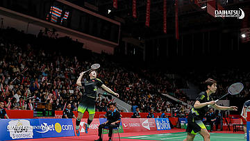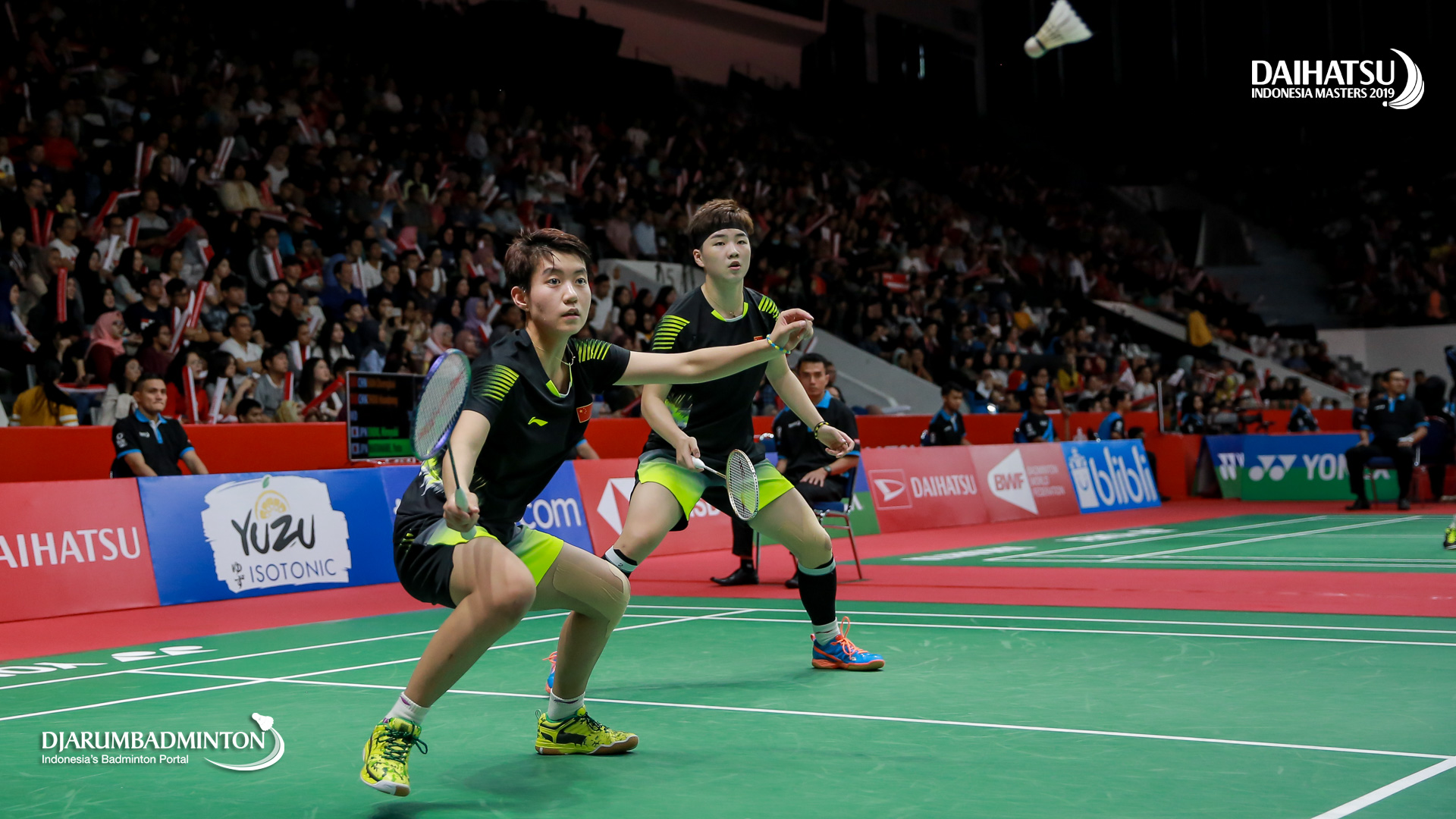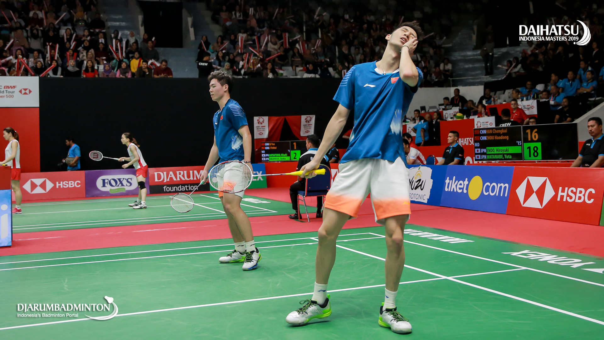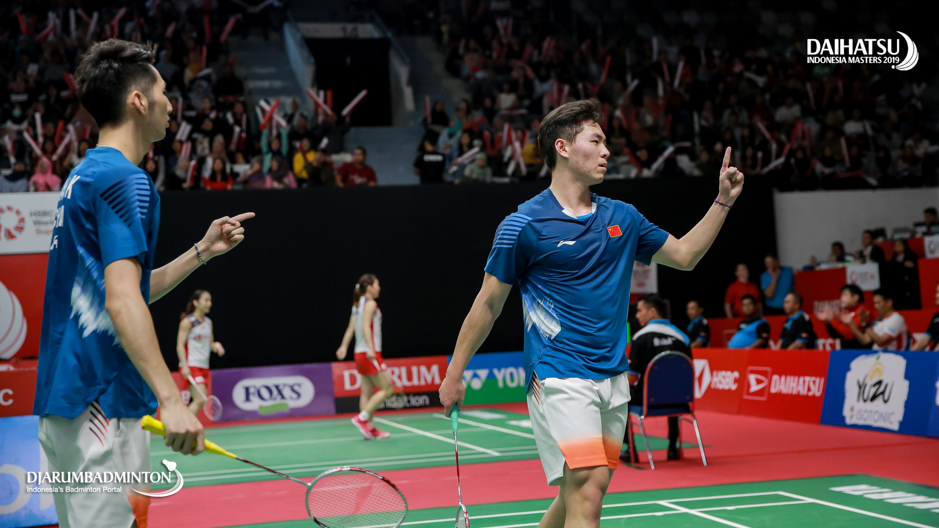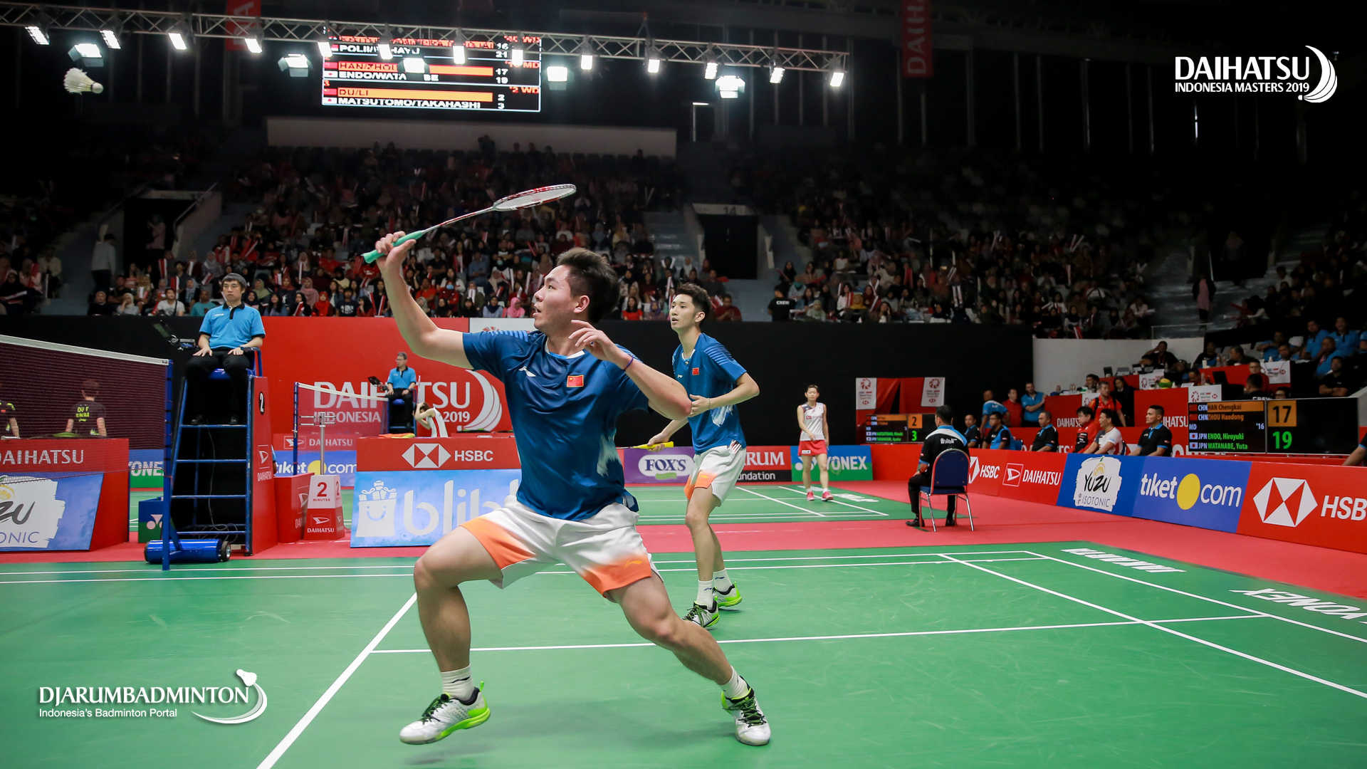 HAN Chengkai/ZHOU Haodong (Tiongkok) bersiap melepaskan serangan