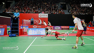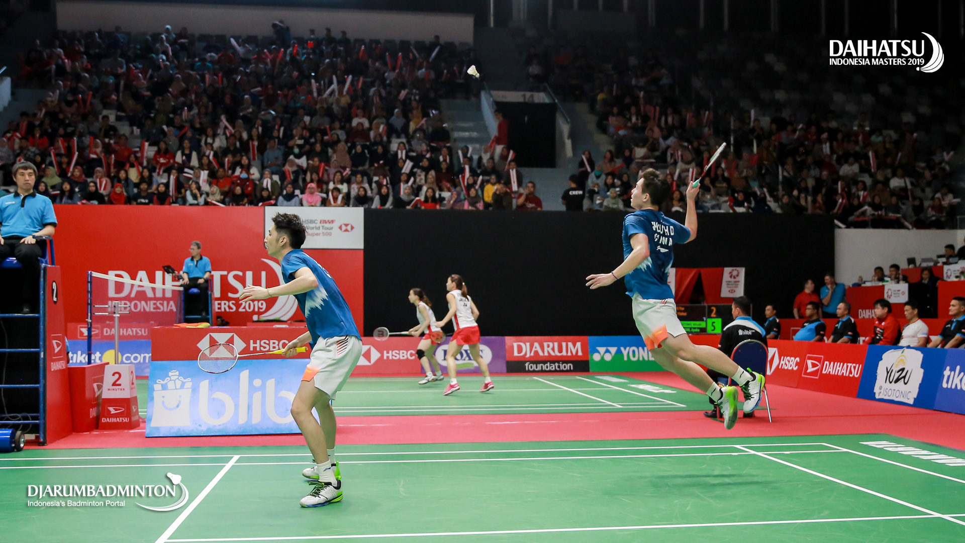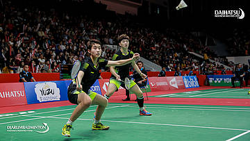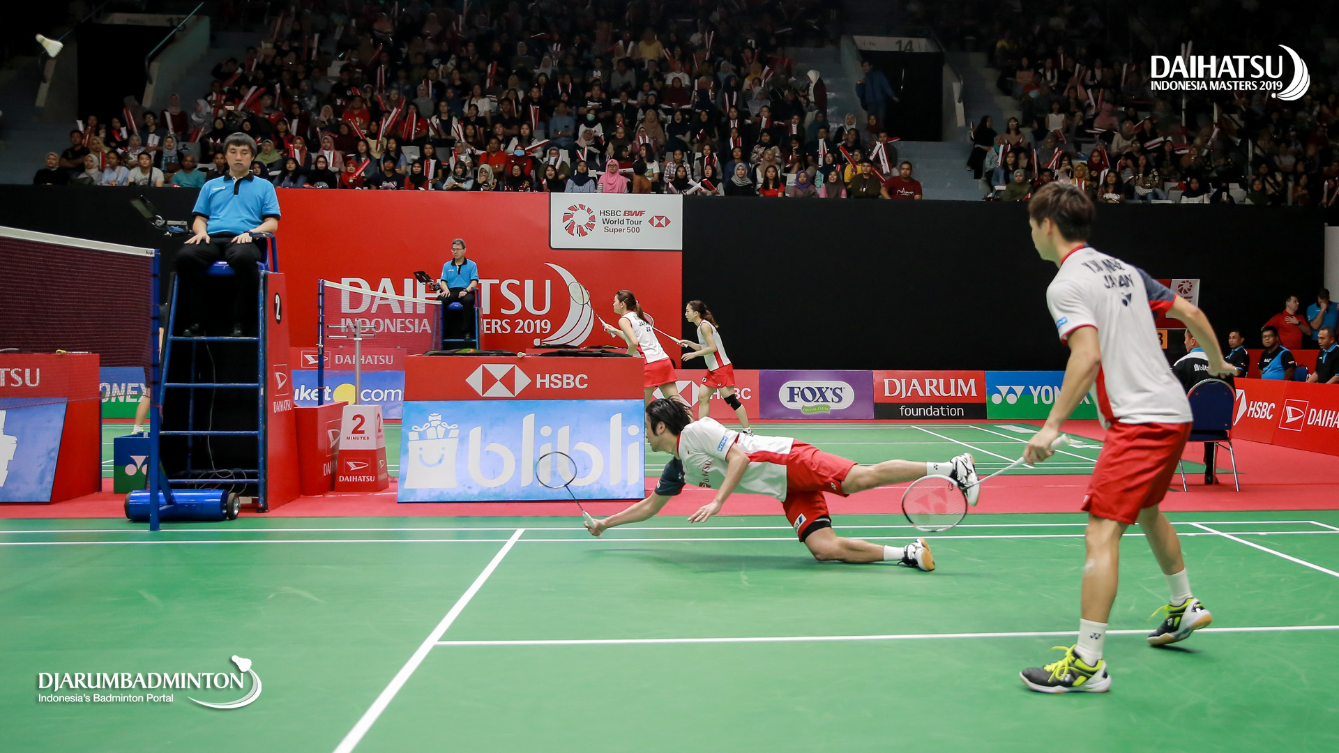 Hiroyuki ENDO/Yuta WATANABE (Japan) berusaha mengembalikan serangan