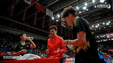 DU Yue/LI Yinhui (Tiongkok) diberi pengarahan oleh pelatih saat waktu interval