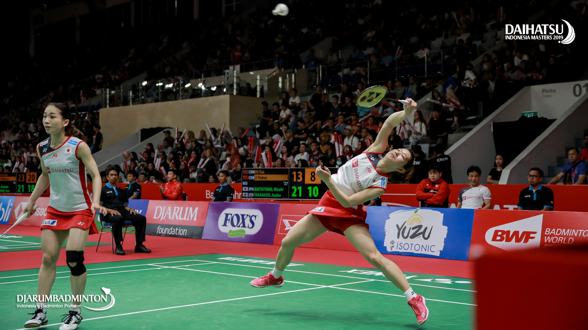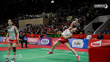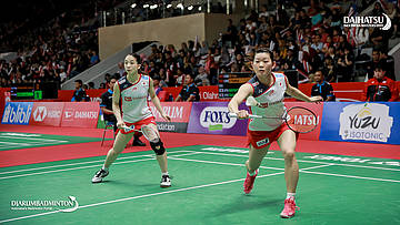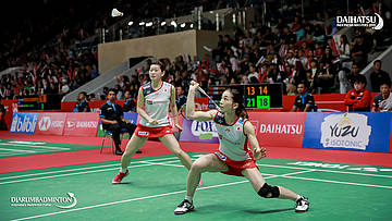 Misaki MATSUTOMO/Ayaka TAKAHASHI (Japan) berusaha mengembalikan serangan