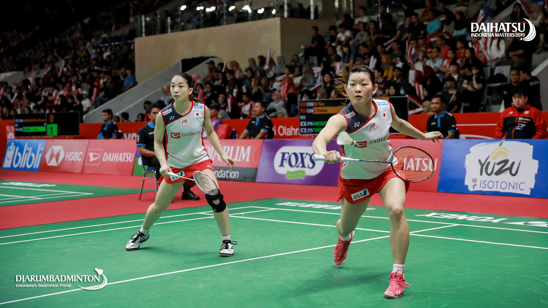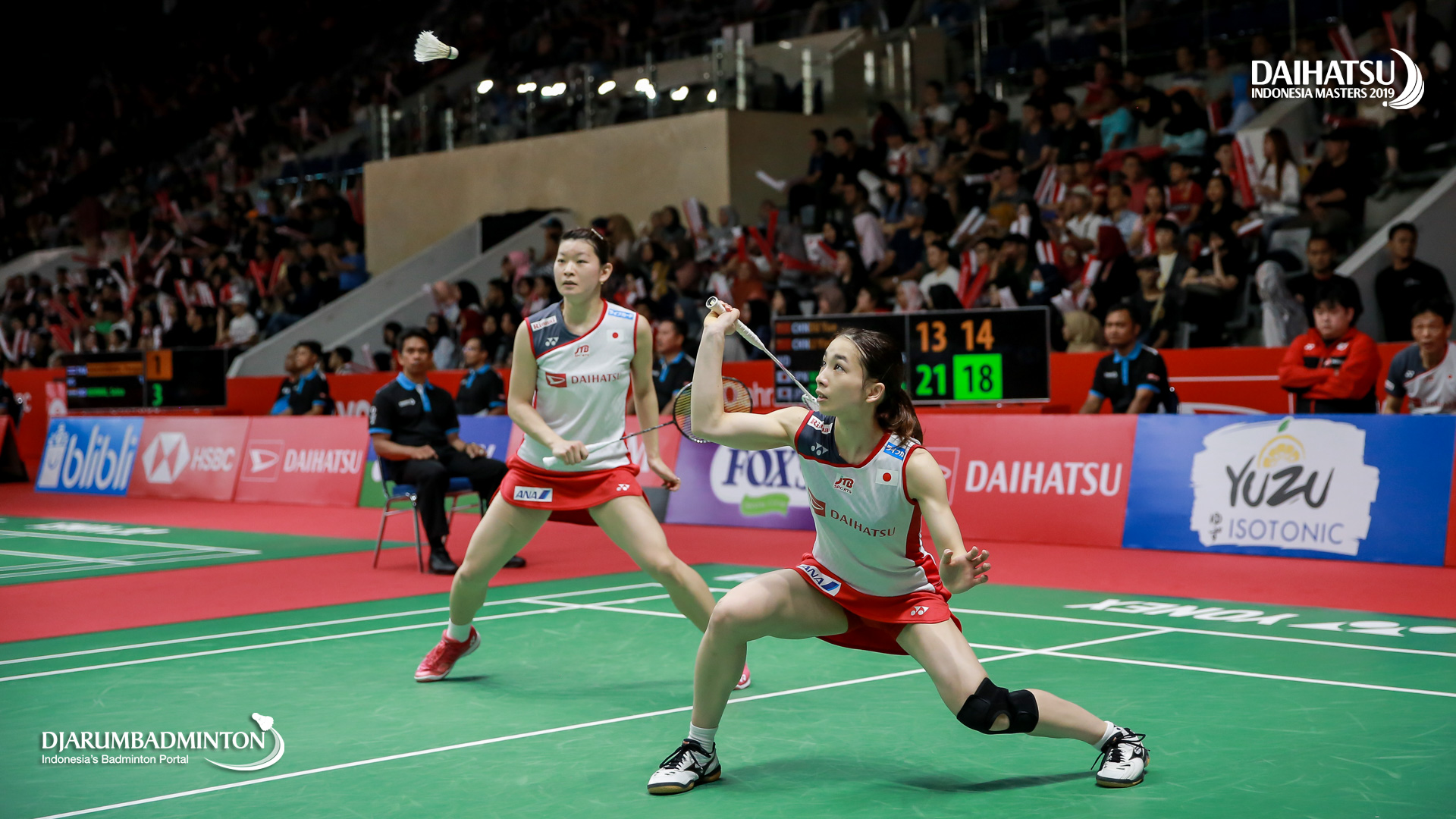 Misaki MATSUTOMO/Ayaka TAKAHASHI (Japan) bersiap menyambut serangan