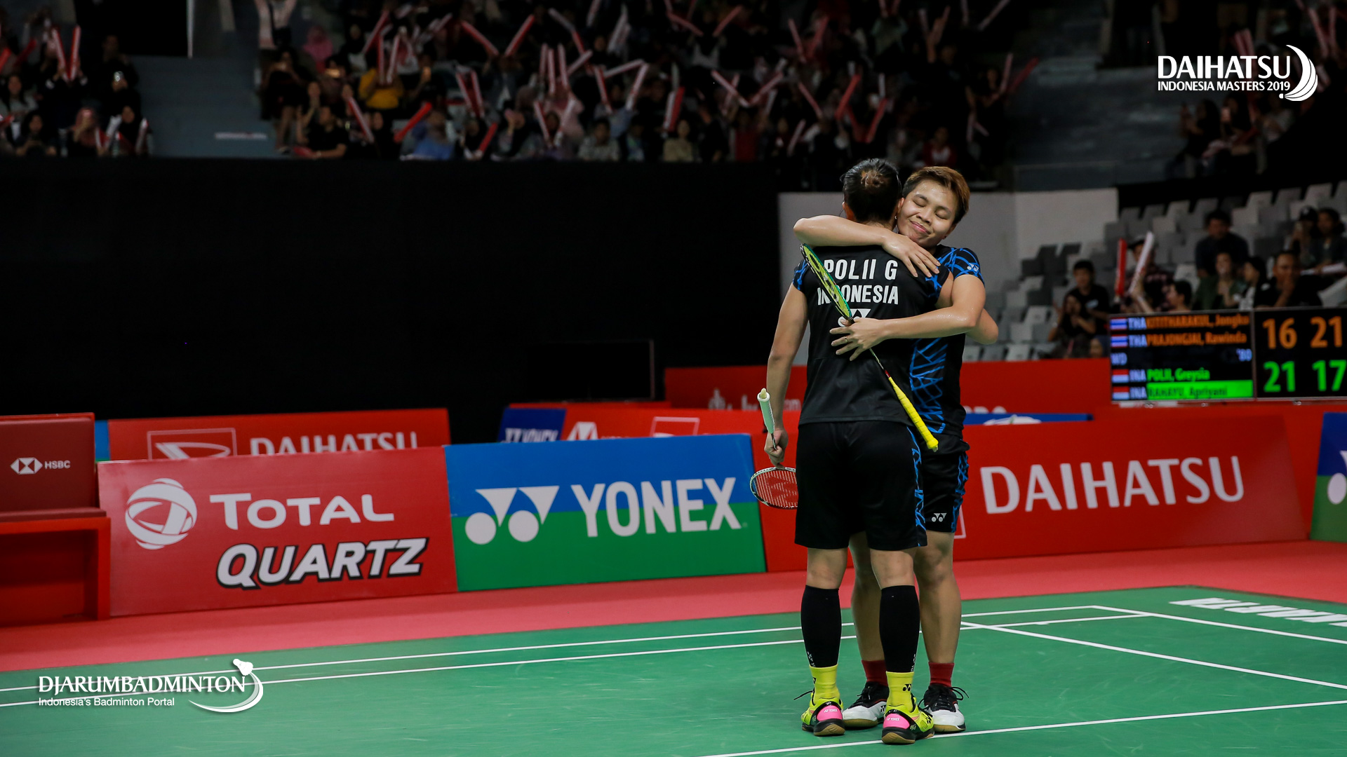 Greysia POLII/Apriyani RAHAYU (Indonesia) berpelukan setelah memenangkan pertandingan