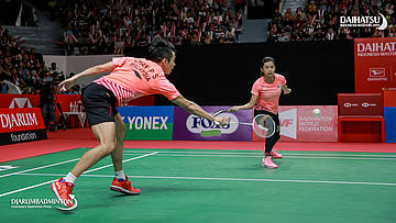 Tontowi AHMAD/Liliyana NATSIR (Indonesia) berusaha mengembalikan serangan