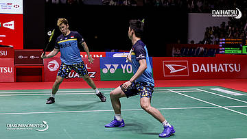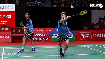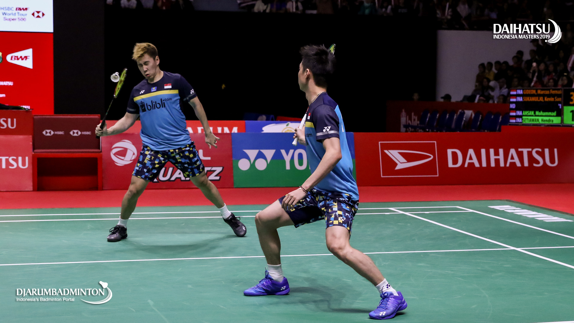 Marcus Fernaldi Gideon/Kevin Sanjaya Sukamuljo (Indonesia) menyambut shuttlecock