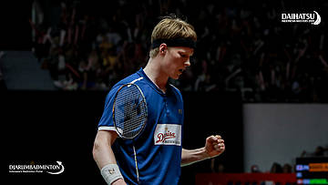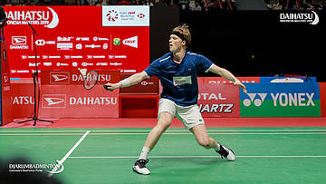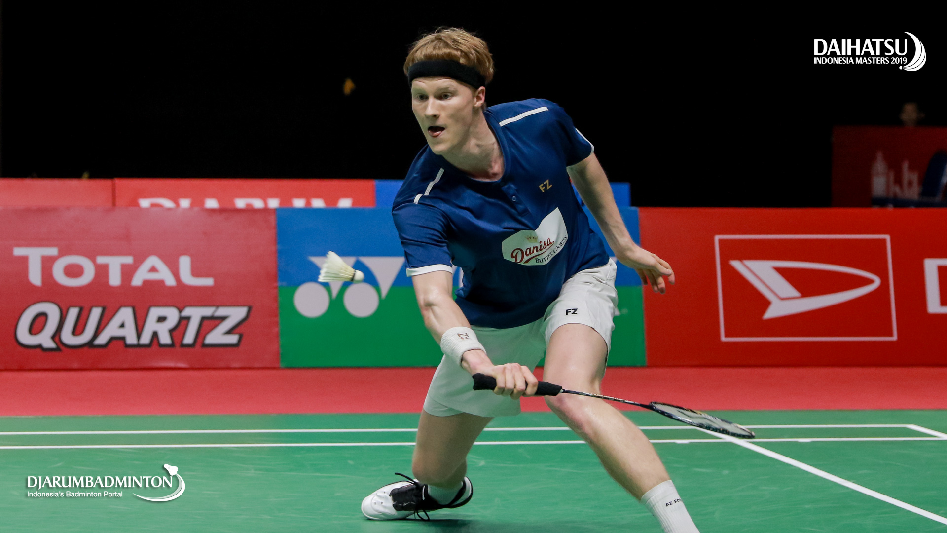 Anders Antonsen (Denmark) bersiap menyambut serangan