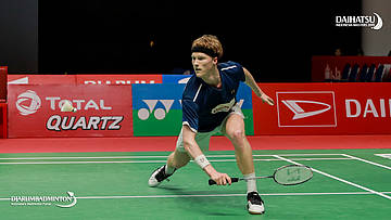 Anders Antonsen (Denmark) bersiap mengembalikan serangan