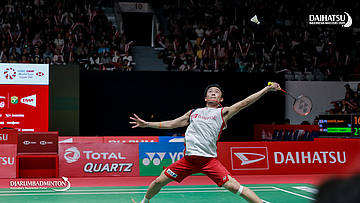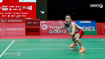 Kento Momota (Japan) berusaha mengembalikan serangan