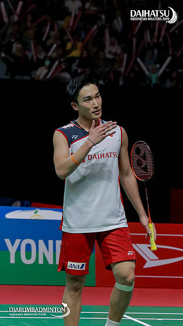 Kento Momota (Japan) berusaha menyambut shuttlecock