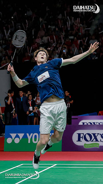 Anders Antonsen (Denmark) bersiap melepaskan serangan