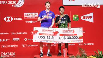 Podium Runner Up Anders ANTONSEN (Denmark) dan Anthony Sinisuka GINTING (Indonesia) Juara Tunggal Putri Daihatsu Indonesia Masters 2020