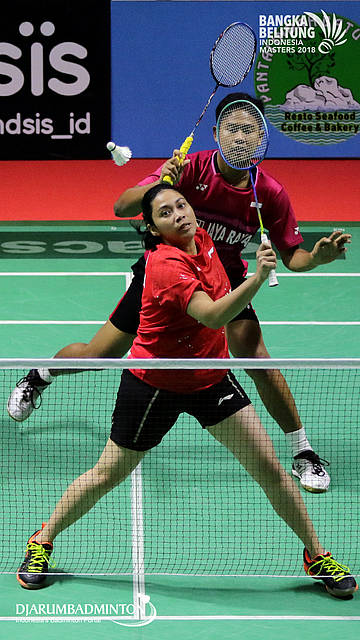 Rinov Rivaldy/Phita Haningtyas Mentari (INA) bersiap menyambar pengembalian