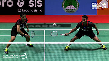 Rehan Naufal Kusharjanto/Siti Fadia Silva Ramadhanti (INA) bersiap menghadang serangan
