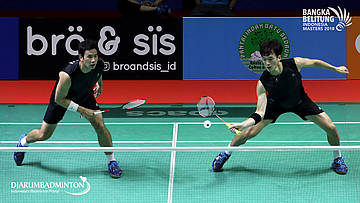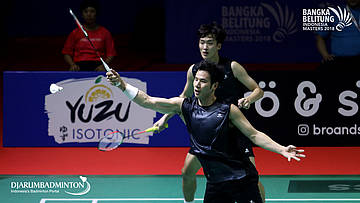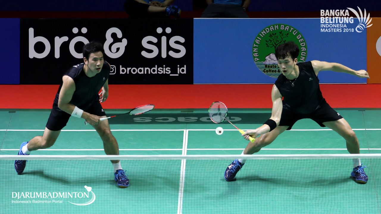 Ko Sung Hyun/Shin Baek Cheol (KOR) mengembalikan shuttlecock