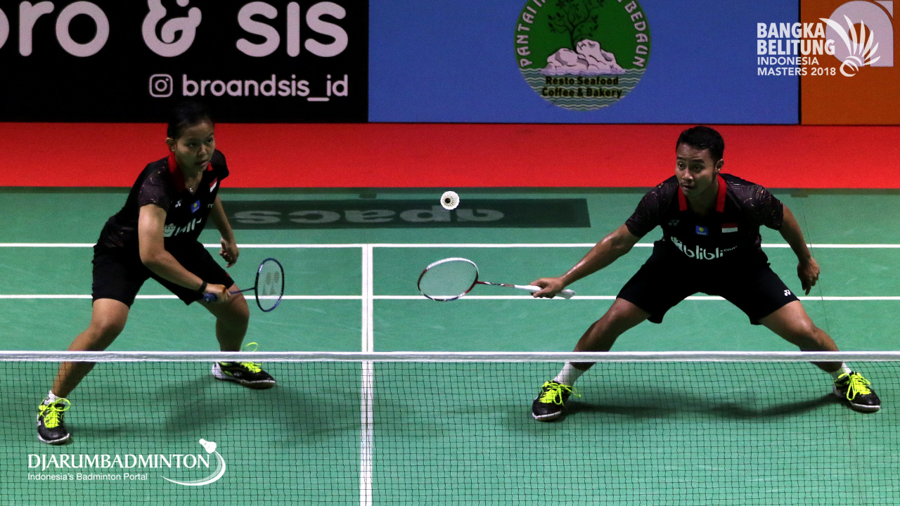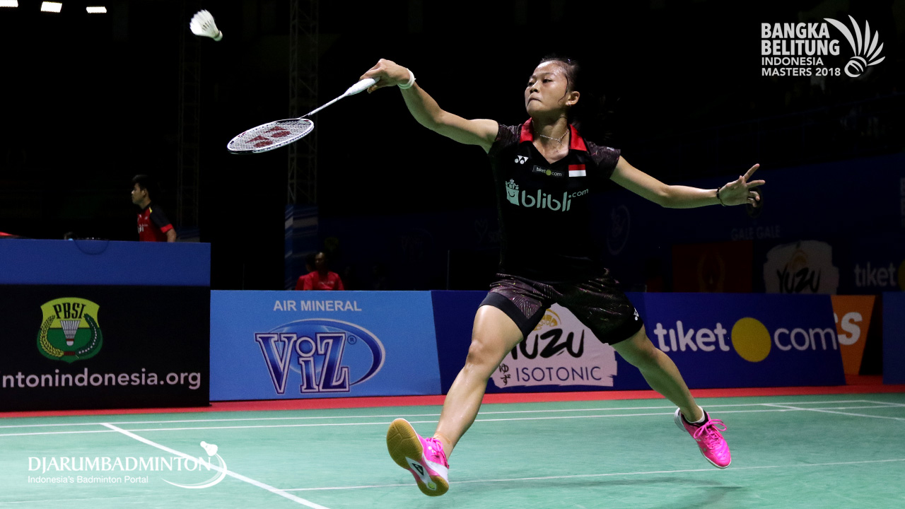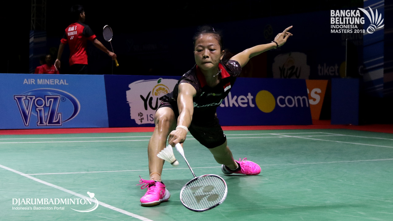 Maretha Dea Giovani/Masita Mahmudin (INA) bersiap menyambar pengembalian tanggung