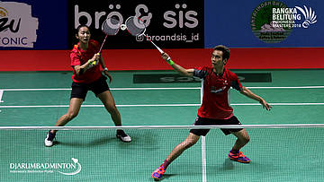 Pramudya Kusumawardana Riyanto/Ribka Sugiarto (INA) mengembalikan shuttlecock