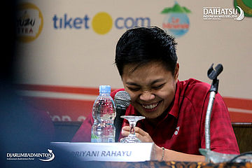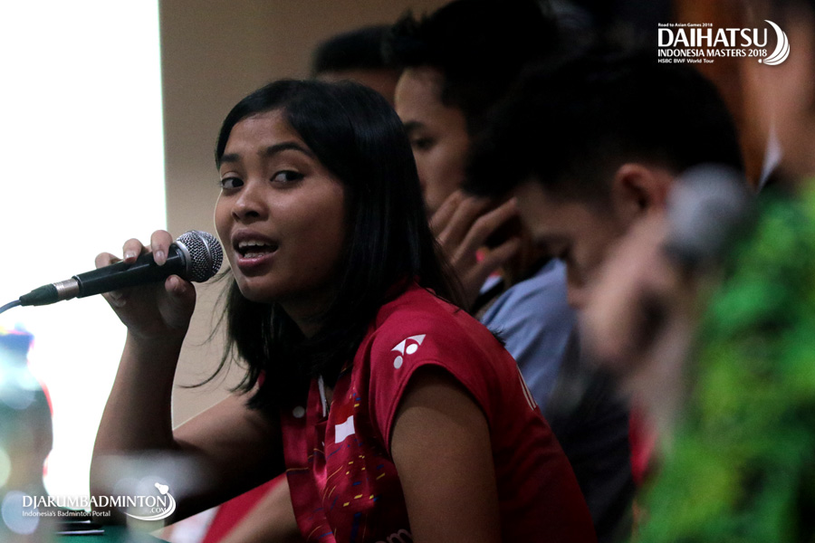Apriyani Rahayu (Indonesia) Tertawa Saat Berusaha Menjawab Pertanyaan Wartawan Saat Press Conference Jelang Daihatsu Indonesia Masters 2018