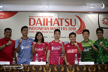 (Dari Kiri) Ketua Pelaksana Daihatsu Indonesia Masters 2018, Ahmad Budiarto, Jonatan Christie, Gregoria Mariska, Kevin Sanjaya Sukamuljo, Apriyani Rahayu, Liliyana Natsir Dan Yuni Kartika Berfoto Bersama Usai Press Conference Indonesia Masters 2018