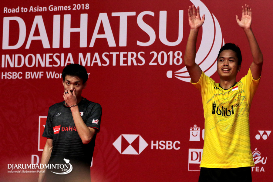 Juara Tunggal Putra Daihatsu Indonesia Masters 2018, Anthony Sinisuka Ginting (Kanan) Bersama Runner Up, Kazumasa Sakai