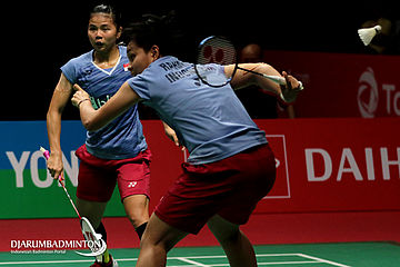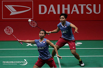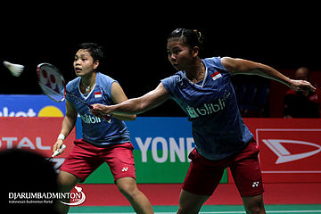 Apriyani Rahayu/Greysia Polii (Indonesia) Mengembalikan Shuttlecock