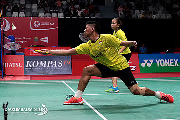 Praveen Jordan/Melati Daeva Oktavianti (Indonesia) Mengembalikan Shuttlecock