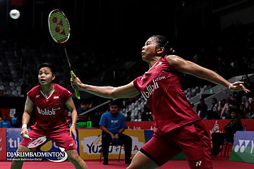 Apriyani Rahayu/Greysia Polii (Indonesia) Mengembalikan Shuttlecock