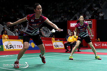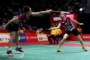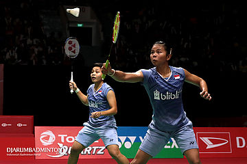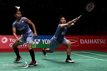 Apriyani Rahayu/Greysia Polii (Indonesia) Mengembalikan Shuttlecock