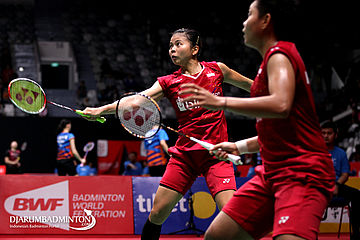 Apriyani Rahayu/Greysia Polii (Indonesia) Menghadang Serangan