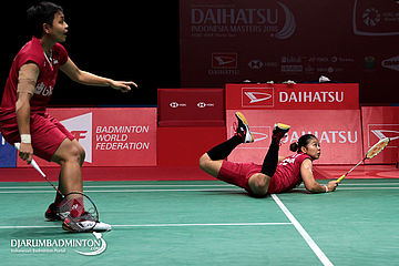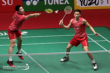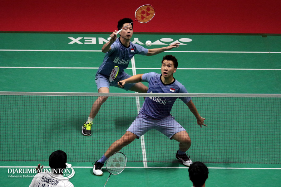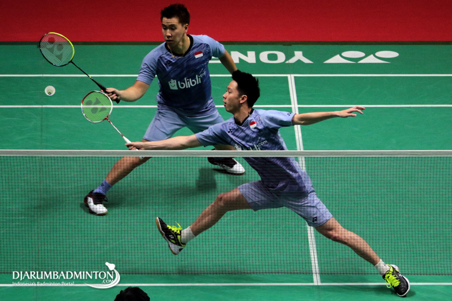 Kevin Sanjaya Sukamuljo/Marcus Fernaldi Gideon (Indonesia) Mengembalikan Shuttlecock
