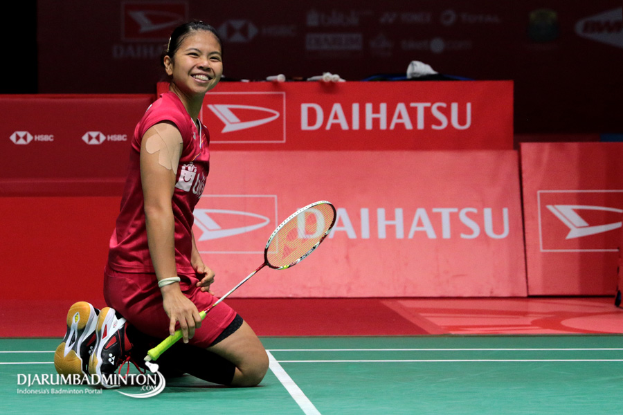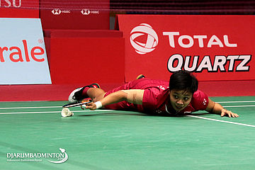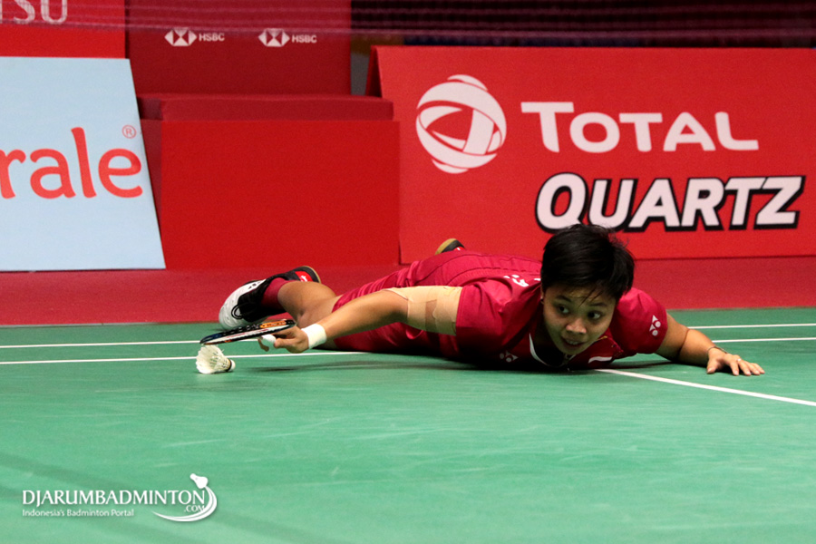 Apriyani Rahayu (Indonesia) Terjatuh Saat Berusaha Menggapai Pengembalian