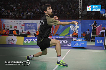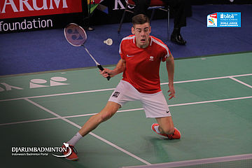 Arnaud Merkle (France) Berusaha Menggapai Shuttlecock