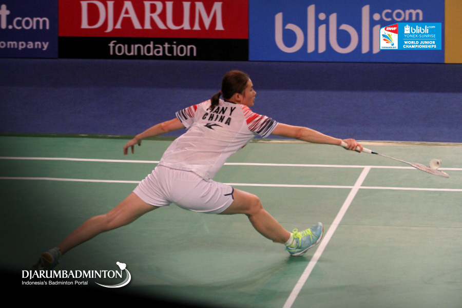 Han Yue (China) Berusaha Menggapai Shuttlecock