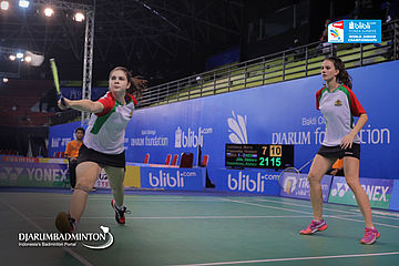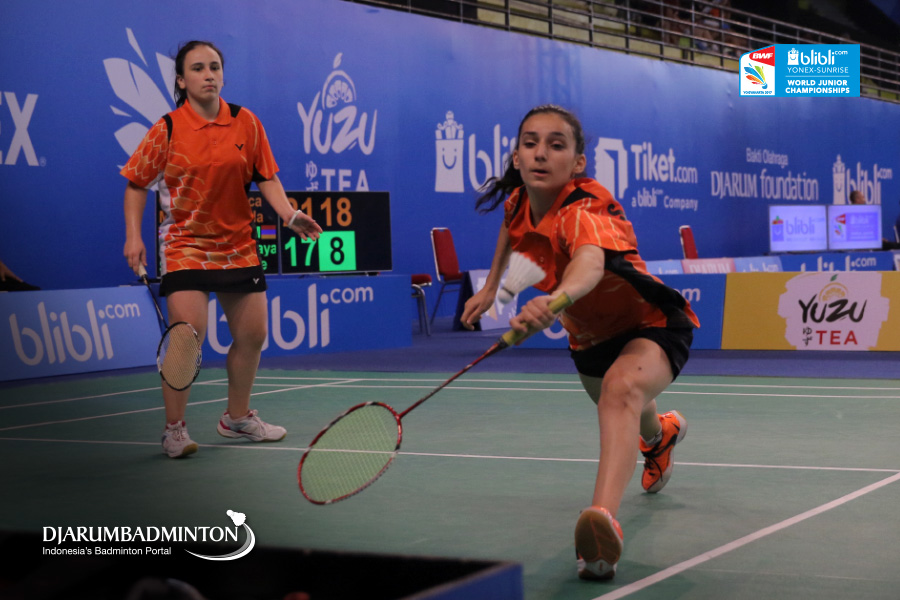 Gayane Mamajanyan/Mane Stepanyan (Armenia) Berusaha Menggapai Shuttlecock