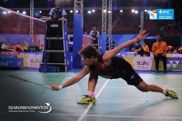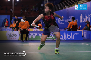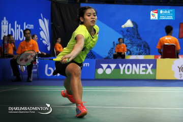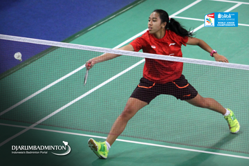 Gregoria Mariska Tunjung (Indonesia) Berusaha Menggapai Shuttlecock
