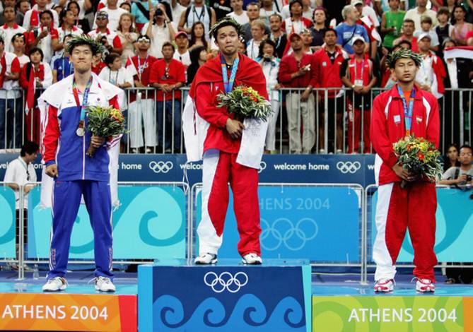 Pada tahun 2004, puasa medali emas dari nomor tunggal di dua kali Olimpiade 1996 dan 2002 akhirnya terpecahkan oleh pebulutangkis muda andalan Indonesia, Taufik Hidayat. pria asal Jawa Barat itu mampu menyumbangkan medali emas Olimpiade Athena 2004, setelah di laga final menghentikan perlawanan Shon Seung-mo dari Korea. - Hendra Setiawan/Markis Kido